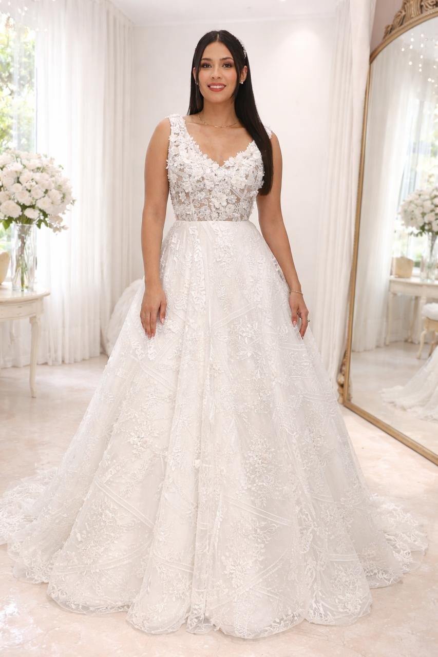2221 – VESTIDO DE NOIVA PRINCESA TODO EM RENDA IMPORTADA 3D C ALCAS LARGAS