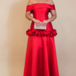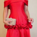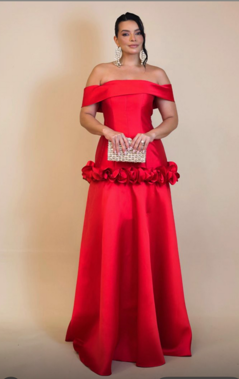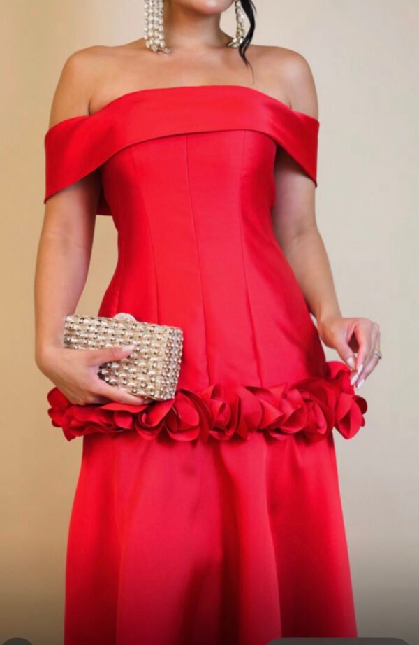 Vestido de Festa Longo Vermelho Off-Shoulder Satin com Rosetas Florais na Saia e Corpete Estruturado