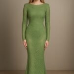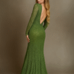 Vestido longo em renda com mangas longas, modelagem ajustada e decote profundo nas costas. Sofisticado e atemporal, perfeito para eventos elegantes.